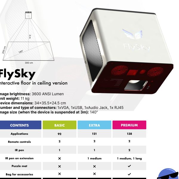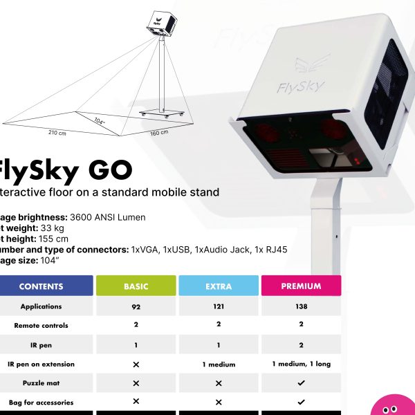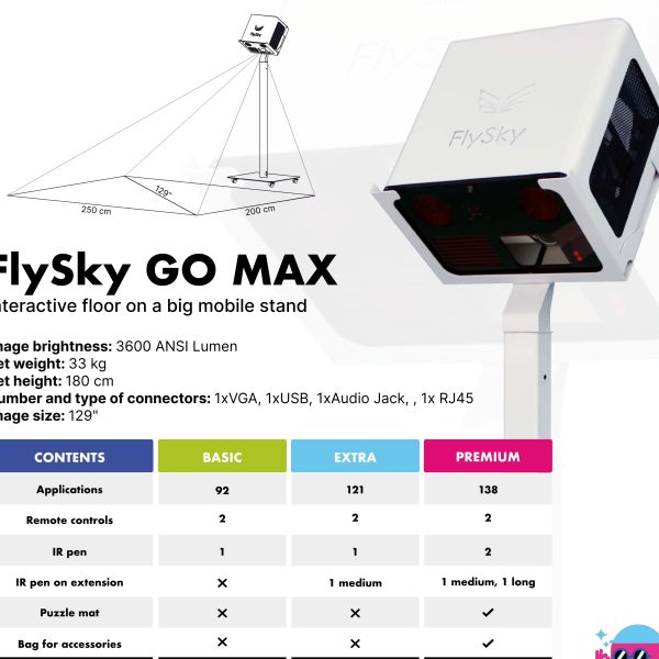 FlySky Pavimento Interattivo è uno strumento versatile per l’istruzione, la formazione e la terapia. Offre un’esperienza di apprendimento coinvolgente e interattiva attraverso il suo pavimento interattivo, che può essere utilizzato per vari giochi e applicazioni educative. Offre una varietà di giochi educativi che soddisfano diverse materie e stili di apprendimento: giochi di matematica, giochi linguistici, attività scientifiche e STEAM, quiz e quiz, giochi di attività fisica, giochi creativi e artistici, giochi di risoluzione dei problemi e di logica. Utilizza tutti i sensi per rendere l’apprendimento, la formazione e la terapia indimenticabili e divertenti, migliorando la curiosità cognitiva e il pensiero logico. È uno strumento versatile che può essere utilizzato come pavimento e tavolo interattivi, rendendolo adattabile a diversi ambienti ed esigenze. Supporta i bambini con esigenze educative speciali fornendo un ambiente di lavoro appropriato e attraente, che può essere modificato per raggiungere obiettivi terapeutici. FlySky elimina i ritardi nell’interazione dell’utente, si adatta ai cambiamenti nell’illuminazione della stanza e riconosce ed elimina le ombre, garantendo una qualità dell’immagine e un’esperienza utente ottimali. La versione FlySky GO offre mobilità, consentendo di spostarla facilmente tra aule o luoghi diversi senza la necessità di un’installazione permanente. La versione FlySky GO è mobile e può essere facilmente spostata tra aule o luoghi diversi senza la necessità di un’installazione permanente.