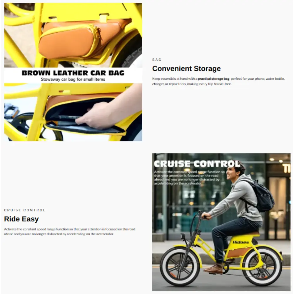 La Hidoes C8 Bici Elettrica è un’opzione versatile e potente per i ciclisti che cercano prestazioni e stile. Dotata di una batteria rimovibile da 48 V/17 Ah, offre un’autonomia di 45-55 chilometri con una singola carica, rendendola ideale per i tragitti quotidiani e le gite di piacere. Il suo motore brushless ad alta velocità da 250 W offre una forte capacità di salita e una velocità massima di 40 km/h, garantendo una guida fluida ed efficiente su vari terreni. La bici è dotata di pneumatici larghi da 20 pollici con eccellente aderenza e resistenza alle forature, che la rendono adatta per neve, sabbia o sentieri accidentati. Un sistema di sospensione a molla idraulica garantisce comfort assorbendo gli urti su strade sconnesse. Ha una morbida sella in pelle marrone, progettata per comfort e stile. Il suo design ergonomico garantisce un’esperienza di guida confortevole, anche durante i viaggi più lunghi. La sella completa il vivace telaio in ferro giallo della bici, aggiungendo un tocco di eleganza alla sua estetica generale. La sicurezza è prioritaria con freni a disco anteriori e posteriori per una potenza di arresto affidabile e fari e luci posteriori a LED per la visibilità. Con il suo telaio in ferro resistente, il design ergonomico e l’intuitivo LCD, Hidoes C8 unisce funzionalità ed estetica, soddisfacendo sia i pendolari urbani che gli amanti dell’avventura.