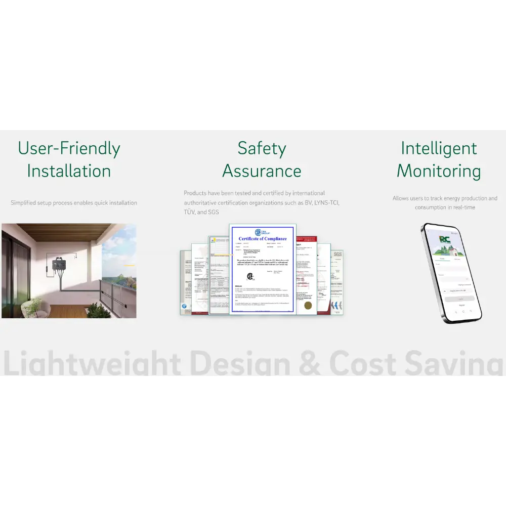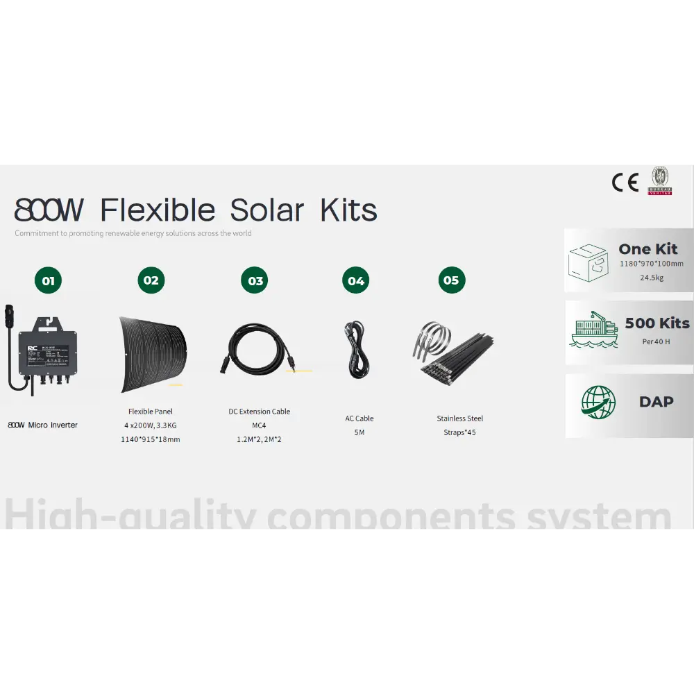 Il Kit Solare Flessibile per Balcone – Plug & Play (800 Watt) è una soluzione intelligente ed efficiente per l’energia solare residenziale, ideale in particolare per balconi o installazioni in spazi limitati. Questi kit sono dotati di pannelli fotovoltaici flessibili leggeri, facili da montare e adattabili a superfici curve o irregolari, rendendoli perfetti per ambienti urbani o tetti non convenzionali. Ogni kit include moduli solari ad alta efficienza, un microinverter e tutti gli accessori di montaggio necessari. Il sistema è progettato per l’installazione plug-and-play, consentendo agli utenti di configurarlo rapidamente senza l’aiuto di un professionista. Inoltre, i costi di installazione e manutenzione sono minimi, poiché è plug-and-play e non richiede alcuna configurazione professionale. Supporta anche il monitoraggio dell’energia in tempo reale, consentendo di monitorare la produzione e i consumi di energia tramite un’app intuitiva. Certificato da enti internazionali come TÜV e SGS, il Kit Solare Flessibile da 800 W soddisfa rigorosi standard di sicurezza e prestazioni. Che tu voglia ridurre le bollette della luce o fare un passo avanti verso l’indipendenza energetica, questo sistema da 800 W offre una scelta affidabile ed ecosostenibile.