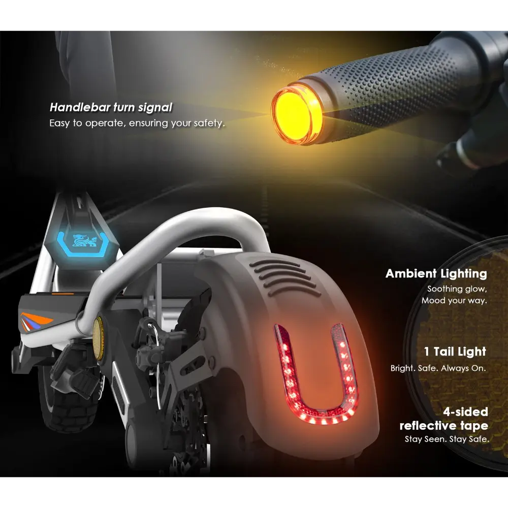 - Illuminazione: adesivi laterali ambientali, luce anteriore e catarifrangenti per la visibilità notturna