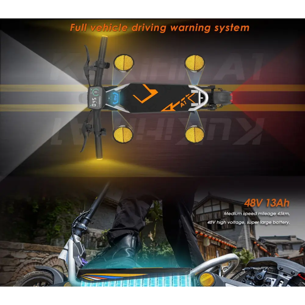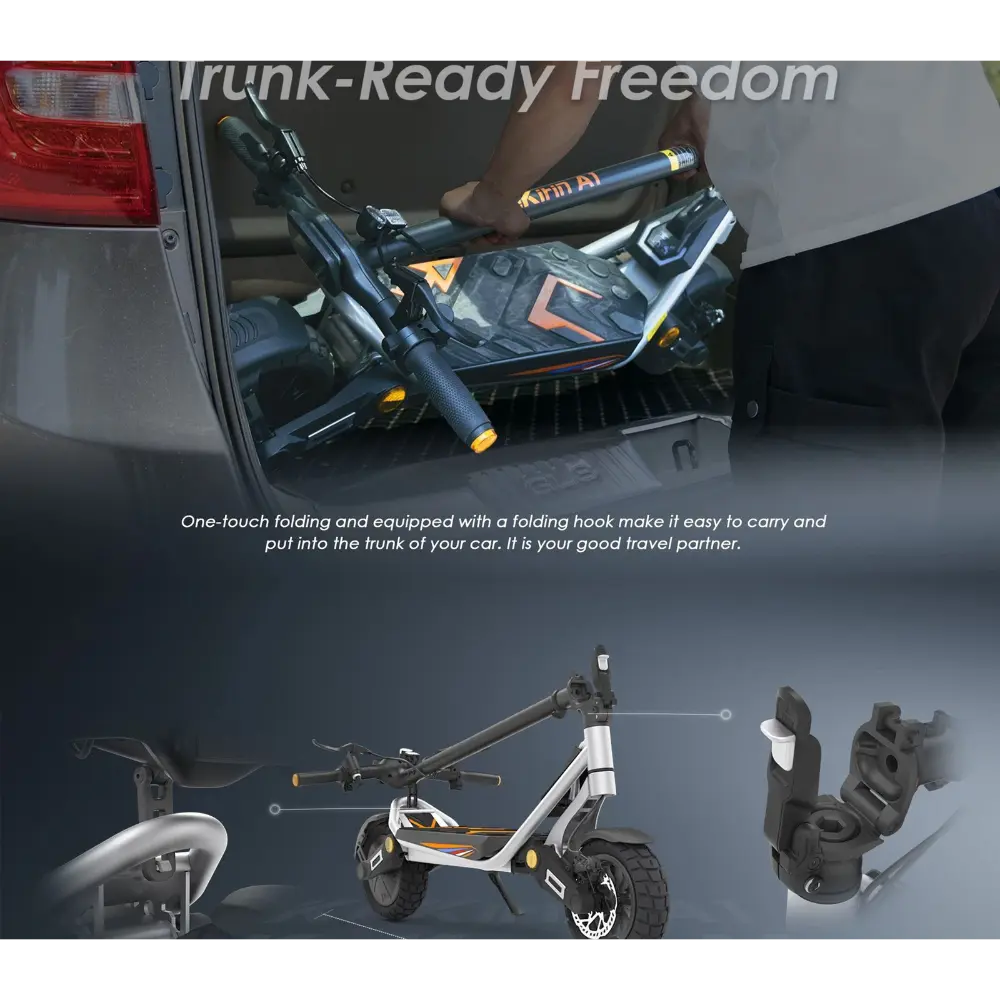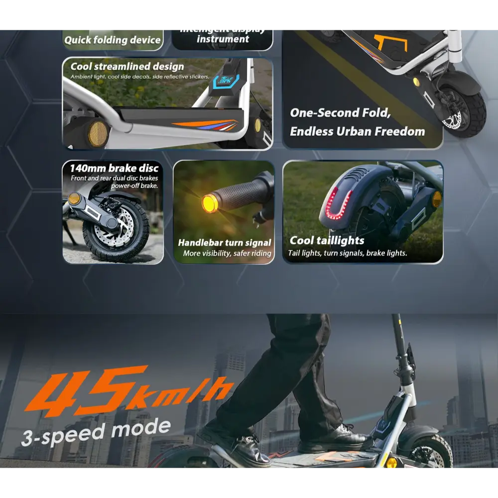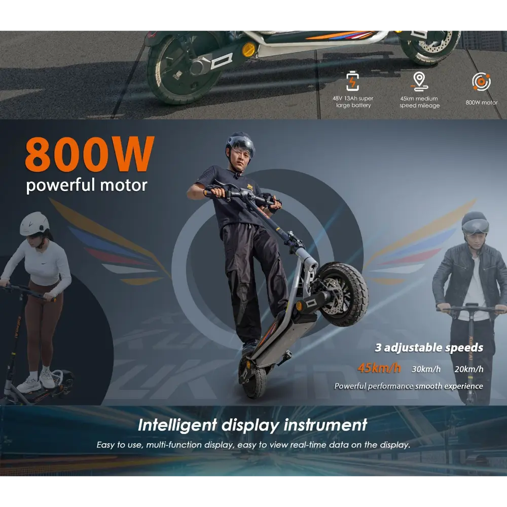 Il KuKirin A1 Monopattino Elettrico è un monopattino elettrico elegante e potente, progettato per gli spostamenti urbani e le avventure del fine settimana. È dotato di un motore brushless da 800 W che raggiunge una velocità massima di 45 km/h, rendendolo uno dei modelli più veloci della sua categoria. Alimentato da una robusta batteria al litio da 48 V 13 Ah, offre un’autonomia fino a 45 chilometri con una singola carica, ideale per i viaggi di media distanza. I suoi pneumatici tubeless da 10 pollici offrono un’aderenza e una stabilità eccellenti su diversi terreni, tra cui asfalto, ghiaia e ciottoli. Il monopattino è dotato di freni a doppio disco e di un sistema di frenata con spegnimento automatico, che garantisce una frenata reattiva e sicura, anche ad alte velocità. Per un maggiore comfort, include ammortizzatori anteriori e posteriori che attenuano le irregolarità del terreno. Il KuKirin A1 vanta anche un display LCD intelligente che mostra velocità, livello della batteria e modalità di guida. Con un telaio pieghevole, illuminazione ambientale e un design aerodinamico moderno, è pratico ed elegante. Che tu stia guidando per le strade cittadine o nei parchi, la KuKirin A1 offre una guida dinamica e piacevole.