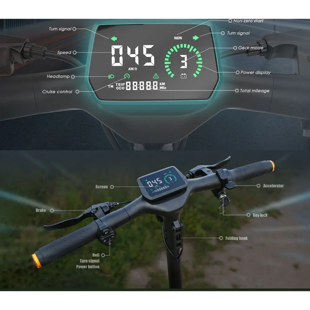 - Display: schermo LCD multifunzione che mostra velocità, livello della batteria e modalità di guida