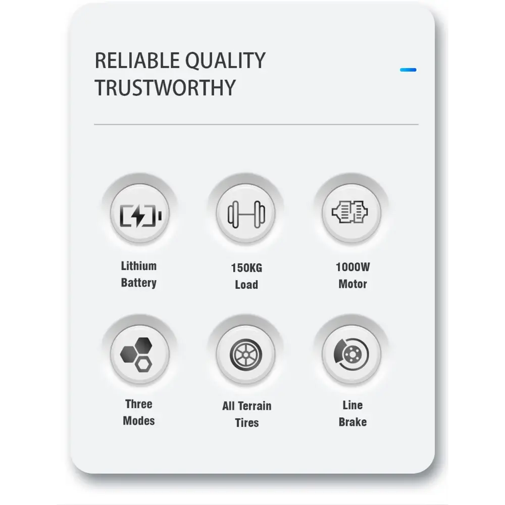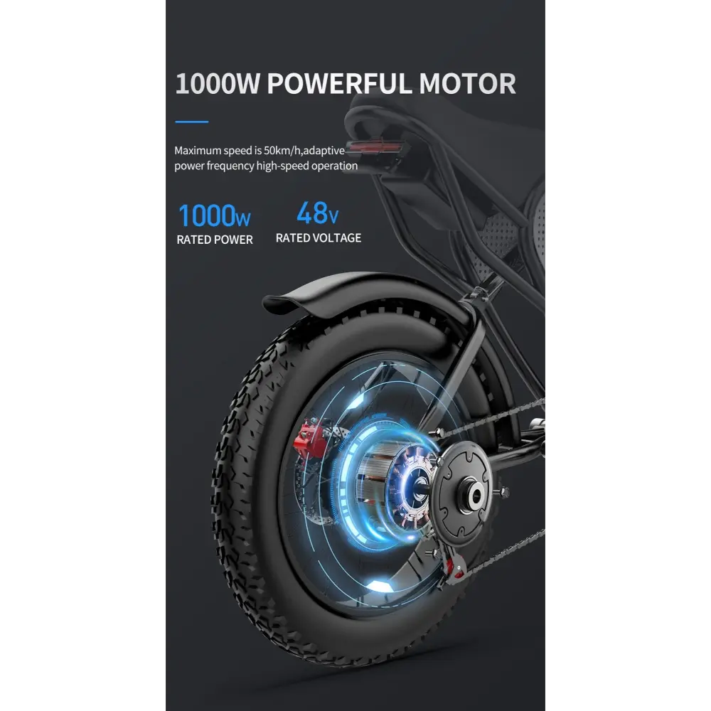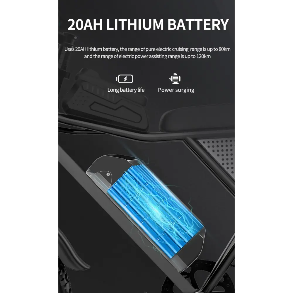 La Ridstar Q20 Bici Elettrica per Tutti i Terreni è una bici elettrica robusta e ad alte prestazioni, progettata sia per gli spostamenti urbani che per le avventure fuoristrada. Alimentata da un robusto motore brushless da 1000 W, offre una coppia e un’accelerazione impressionanti, raggiungendo velocità fino a 50 km/h. La sua batteria al litio da 48 V 20 Ah offre un’autonomia generosa, fino a 120 km in modalità pedalata assistita, rendendola ideale per i viaggi a lunga distanza. Costruita con un resistente telaio in lega di alluminio, la Q20 è dotata di pneumatici larghi da 20 x 4,0 pollici che offrono un’eccellente trazione su diversi terreni, tra cui neve, sabbia e sentieri rocciosi. Il cambio Shimano a 7 velocità offre un controllo flessibile e le doppie sospensioni (anteriore e posteriore) garantiscono una guida confortevole. La sicurezza è migliorata grazie ai doppi freni a disco idraulici, all’illuminazione a LED e a un display LCD che monitora velocità, durata della batteria e chilometraggio in tempo reale. Con il suo design elegante, la comoda sella larga e le molteplici modalità di guida, tra cui puramente elettrica, a pedalata assistita e manuale, la Ridstar Q20 fonde perfettamente potenza, stile e praticità in un’unica emozionante corsa.