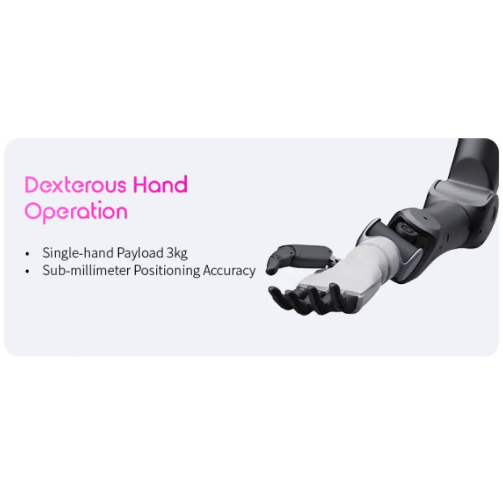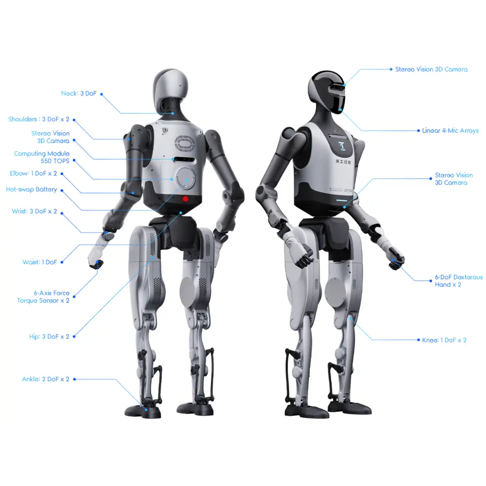 - DOF totale 42: DOF gamba 7 (spalla 3, gomito 1, polso*3) ×2, DOF braccio 6 (anca 3, ginocchio 1, caviglia*2) ×2, DOF testa/collo 3-DOF modulo testa (standard), DOF vita 1, mano destra 6-DOF, mano destra ×2 (standard)