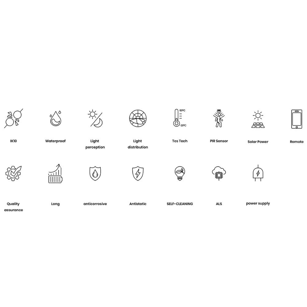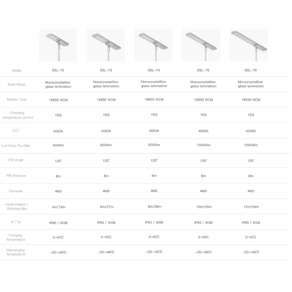 THERMOS 2 SSL-72A LED: 4000LM 4000K Batteria agli ioni di litio: 14,8V 269,36WH Pannello solare: 35,7W / 16,2V Tempo di ricarica: ≤ 8,2 ore Altezza di installazione: 4M Impermeabilità: IP65 Garanzia: 3 anni Materiale: Alluminio 1. Design tutto in uno 2. Con sensore PIR 3. Elevata efficienza luminosa, 230lm/W 4. Tecnologia ALS 5. Pulizia automatica da polvere e neve